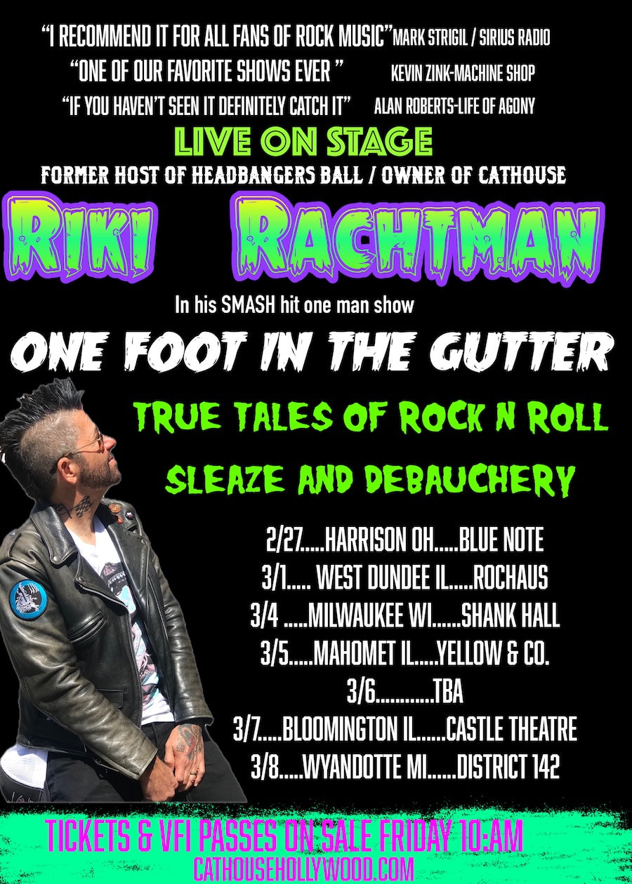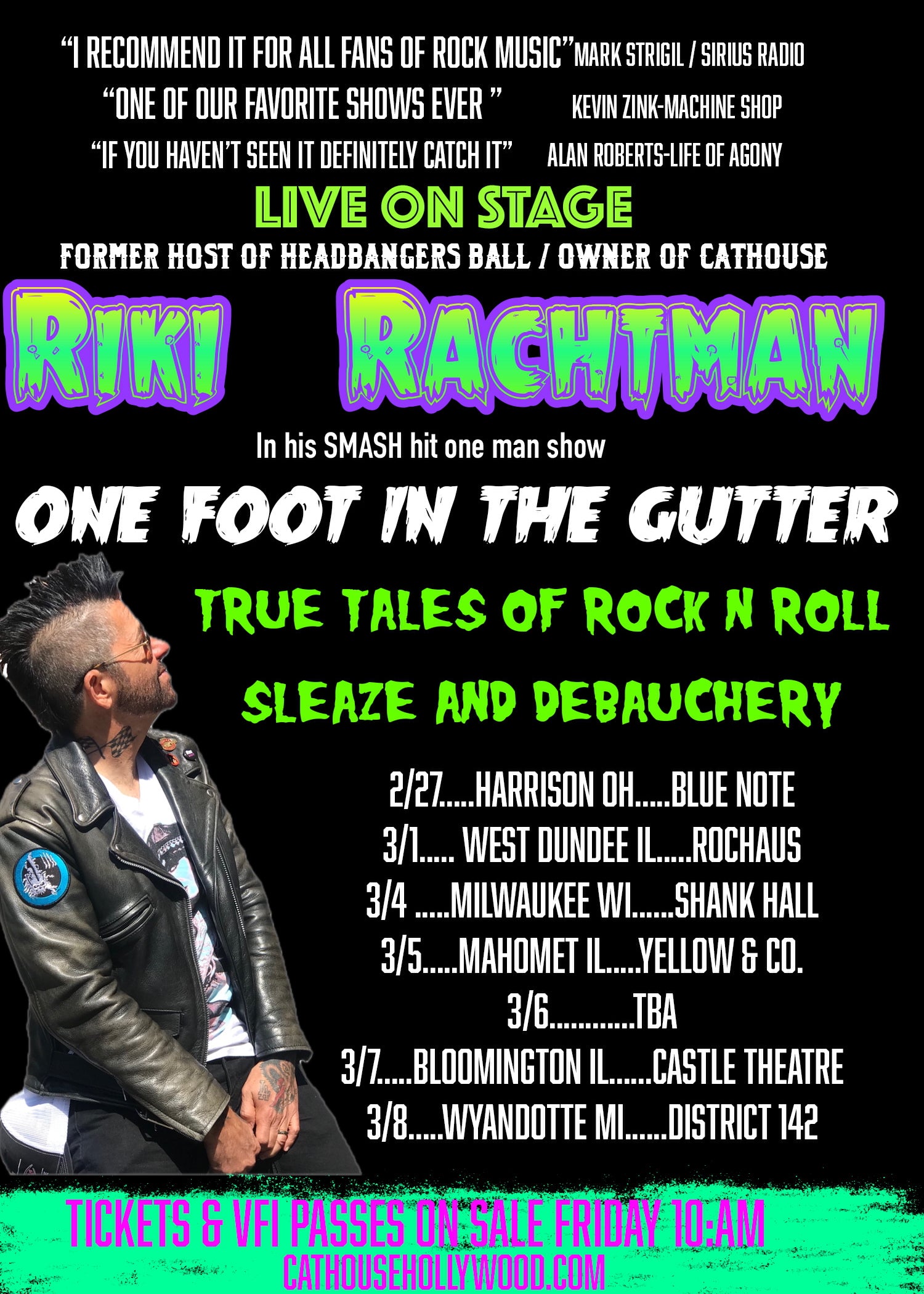 The smash hit is back on tour for 2026. Riki Rachtman's one man show combines multi media with Riki Rachtman's Unbelievable Tales. From growing up in Hollywood watching his friends become the biggest rock stars in the world. Through the opening of his notorious Rock nightclub Cathouse. Hear stories about his 5 years on MTVs Headbangers Ball plus how one left hook made everything come to a crashing halt. It's a rock n roll redemption story. Funny, Shocking,Inspirational and brutally honest