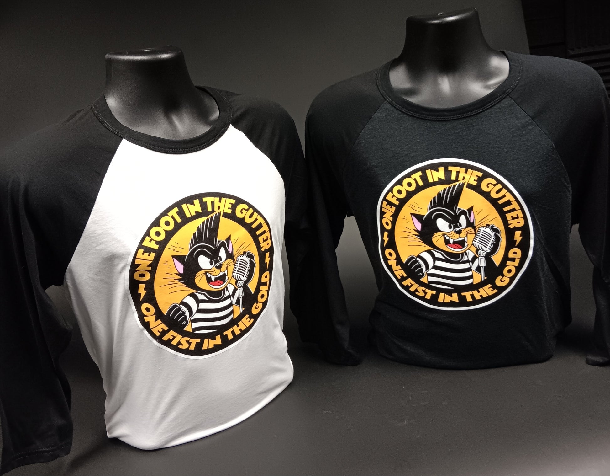 "One Foot In The Gutter One Fist in The Gold " Riki Rachtman ended every episode of Headbangers Ball and every Cathouse Hollywood podcast with those 10 words. He toured with his one man show "One Foot In The Gutter" Now we have this all new design printed on a baseball style jersey in 2 flavors