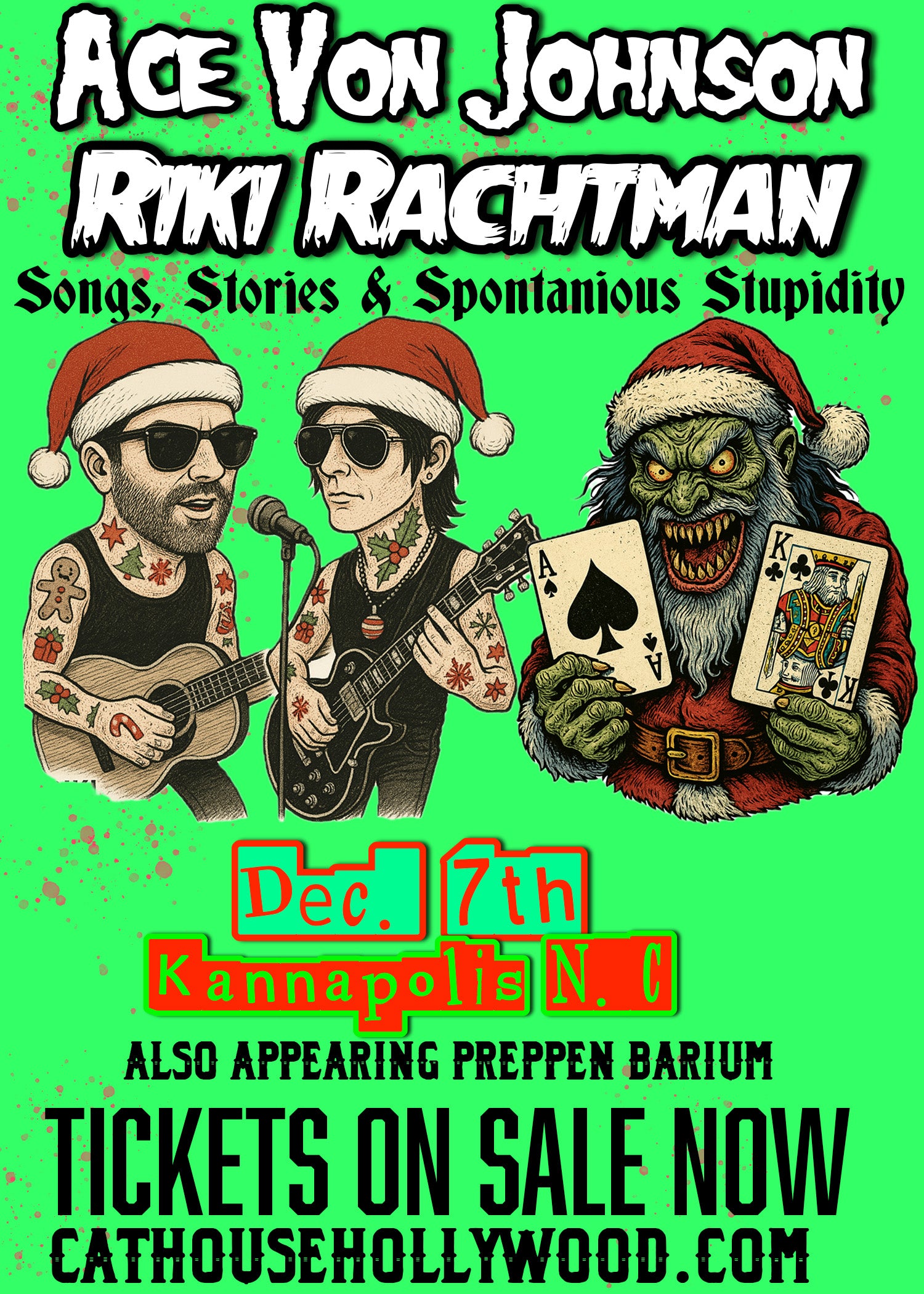 If you attend one show this holiday season go to this one too.Riki Rachtman (Headbangers Ball/Cathouse) and Ace Von Johnson (LA Guns Faster Pussycat) take to the stage for an evening of music, stories and....well who knows exactly what they have planned. The show is located in a private speakeasy under Old Armor Brewery in Kannapolis North Carolina. The doors are at 5:45 Show at 6:00. This begins right after the Very Cathouse Christmas Sale upstairs. You should be at both